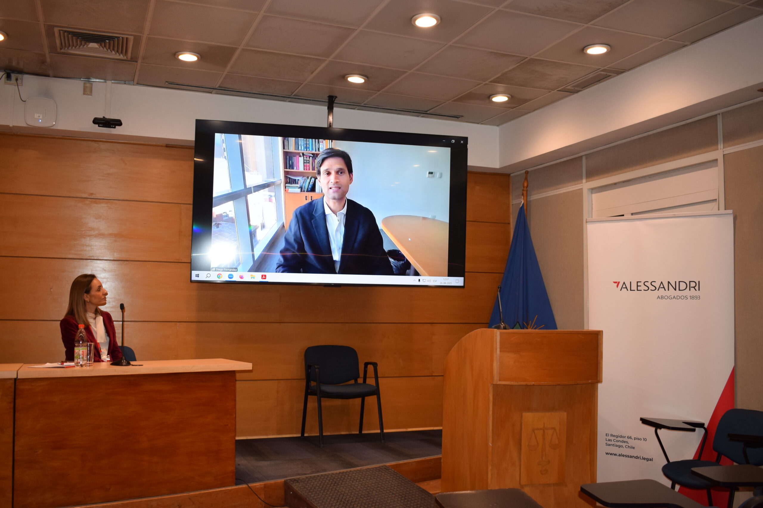 La jornada comenzó con un bloque de bienvenida. Rodrigo Velasco, socio director de Alessandri Abogados y Co-Chair del Latin American Committee de iTechLaw saludó y presentó a los invitados; el decano de la Facultad de Derecho de la Universidad de Chile, Pablo Ruiz-Tagle, compartió experiencias personales con el uso de inteligencia artificial y reflexionó sobre su impacto en el derecho; el profesor Santiago Schuster Vergara aportó una mirada académica sobre los desafíos regulatorios. Además, se transmitió un saludo institucional desde Argentina por parte de Diego Fernández, presidente de iTechLaw.